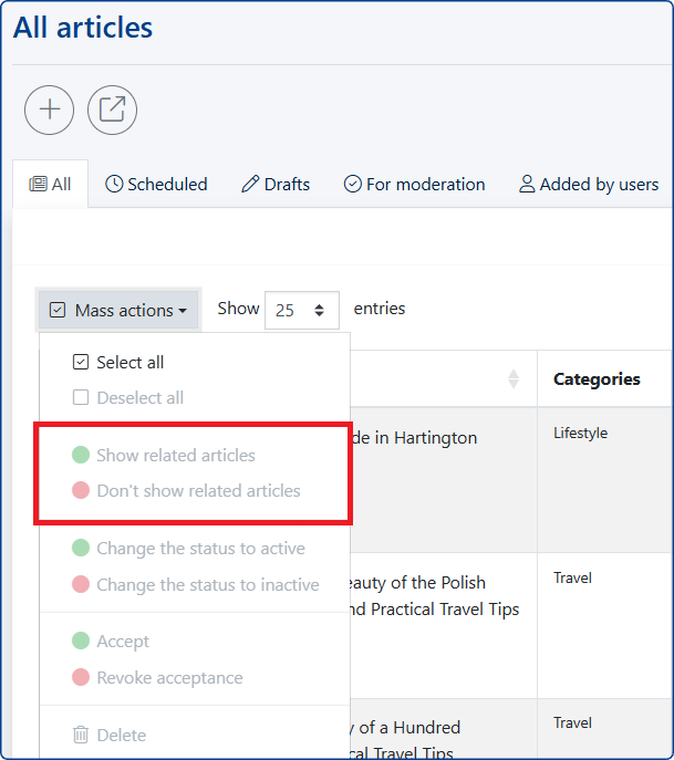 Note for Option B: When selected, buttons will appear in the article list under the [Mass Actions] tab, allowing you to activate/deactivate the extra section for related entries.