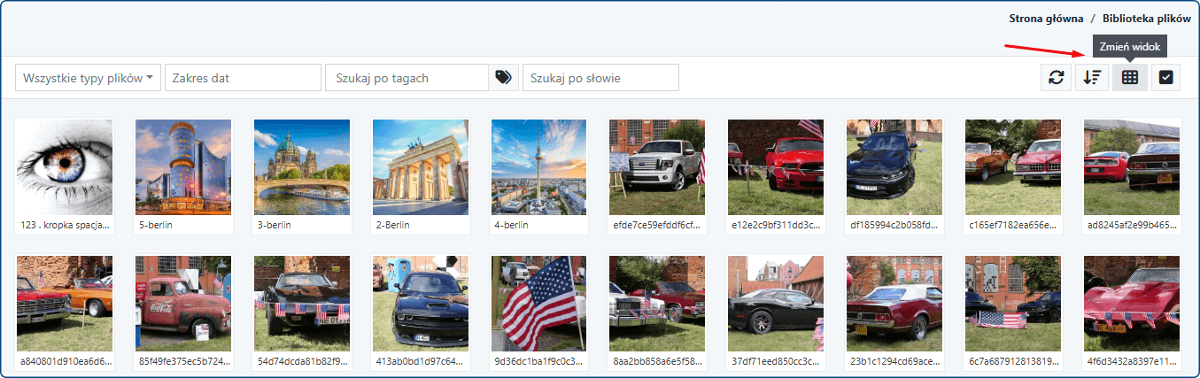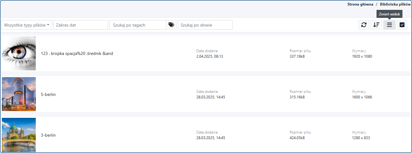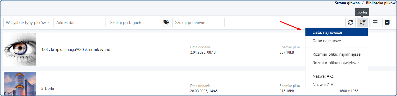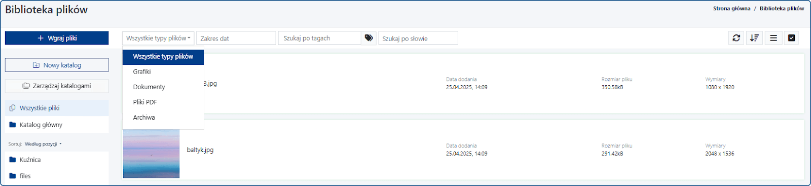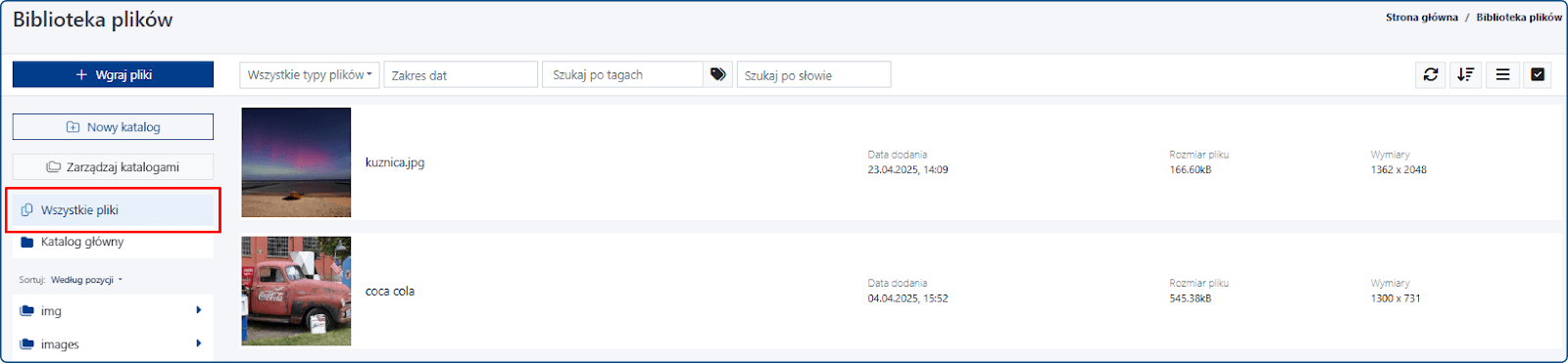 Po przejściu do modułu, system domyślnie wyświetla zawartość zakładki Wszystkie pliki - są one listowane chronologicznie, a więc nowo dodane pliki będą się wyświetlały w górnej części listy.