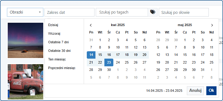 Umożliwia wyszukanie plików dodanych do biblioteki we wskazanym przedziale czasu
