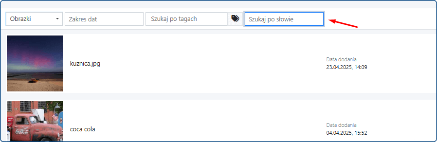 Wyszukuje po haśle w obszarze pól: tytuł, tekst alternatywny, opis, autor