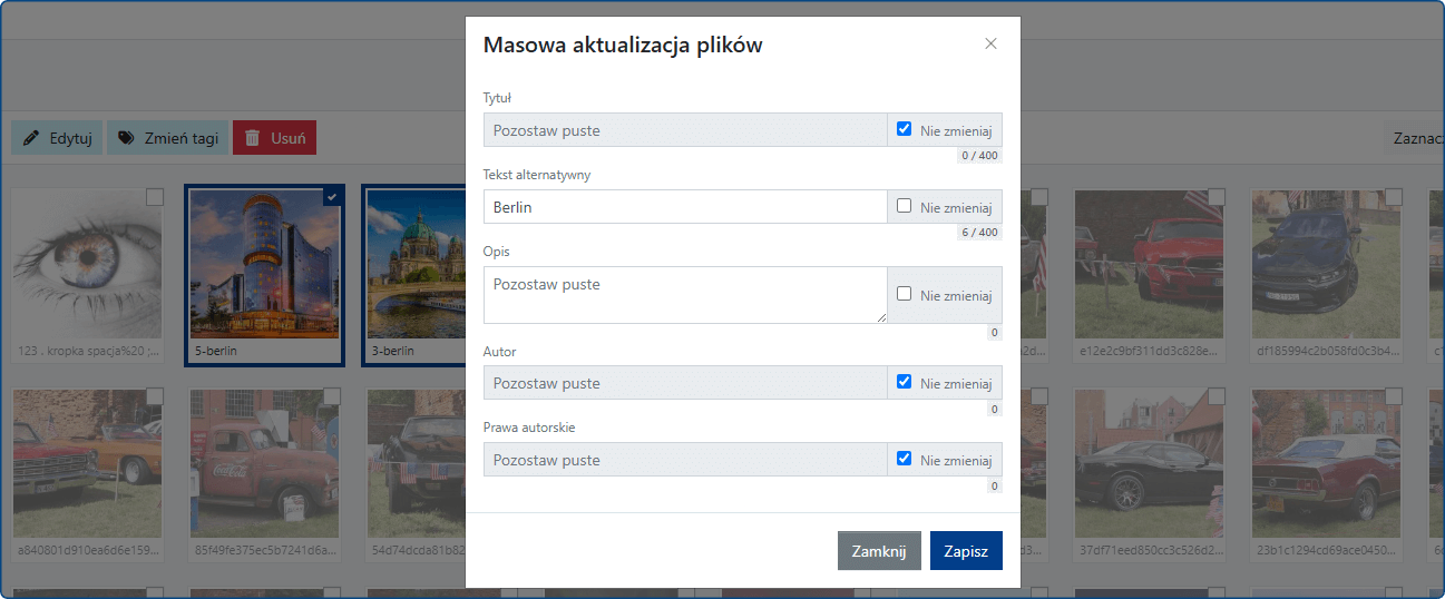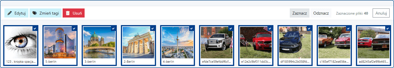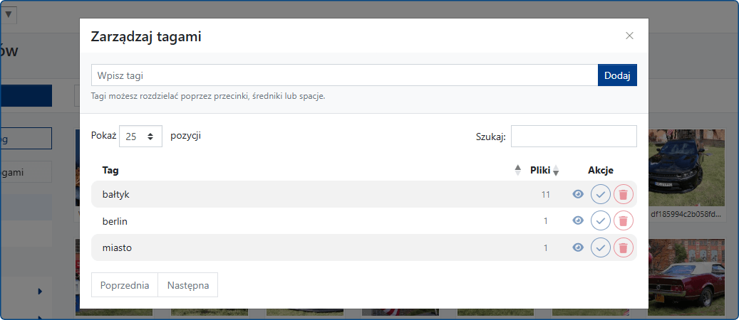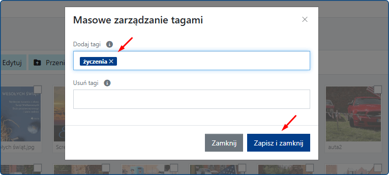 Funkcja umożliwia dodanie lub usunięcie tagu dla jednego lub wielu zaznaczonych na liście plików. W oknie pop up wpisujemy tag, który chcemy dodać (po wpisaniu klikamy klawisz enter) i zapisujemy zmiany poprzez kliknięcie w niebieski przycisk Zapisz i zamknij