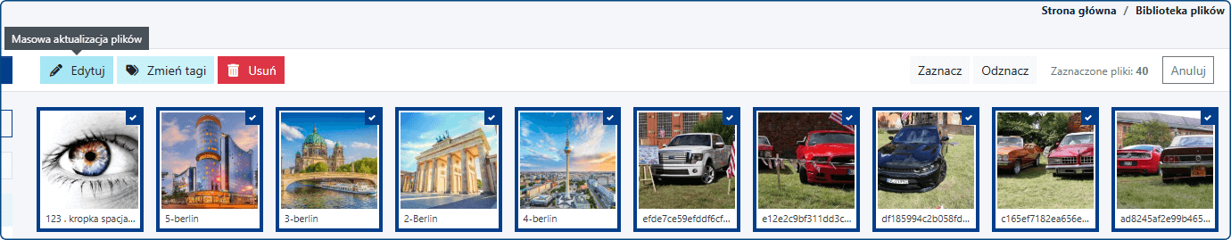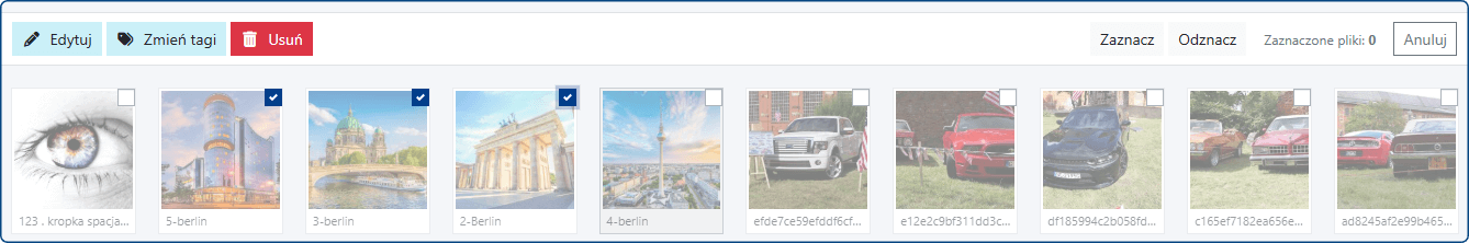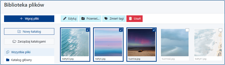 Po zaznaczeniu wybranych plików klikamy w czerwony przycisk Usuń.Biblioteka plików nie posiada funkcji Kosz, a więc usunięcie plików powoduje jego całkowite usunięcie z systemu CMS