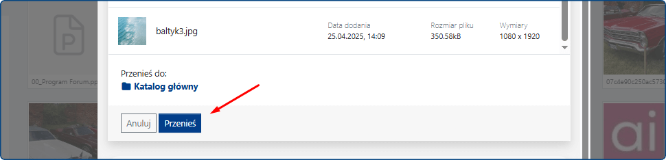 Aby potwierdzić proces przenosin plików, klikamy granatowy przycisk Przenieś lub szary przycisk Anuluj by zrezygnować z wykonania akcji.