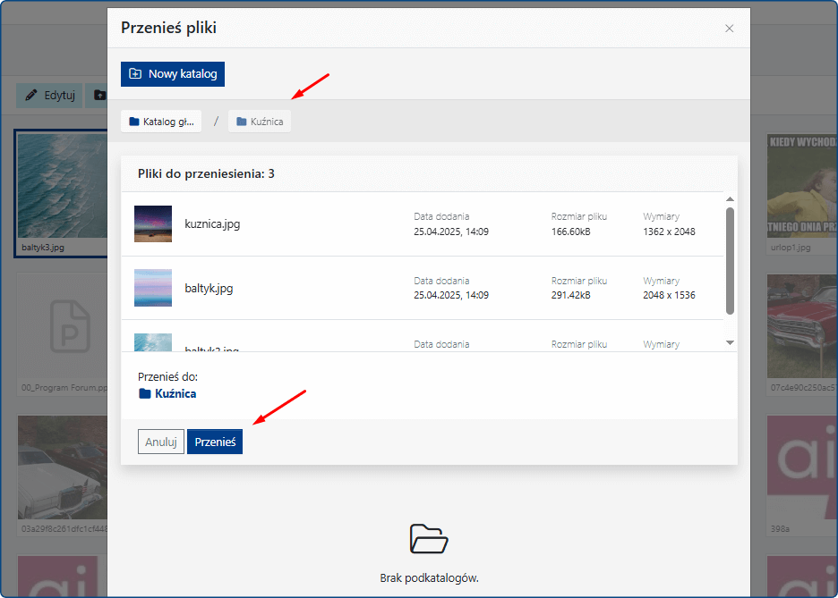 5. Usunięcie katalogu - WAŻNE! Usunięcie katalogu nie spowoduje usunięcia plików z bazy danych systemu CMS