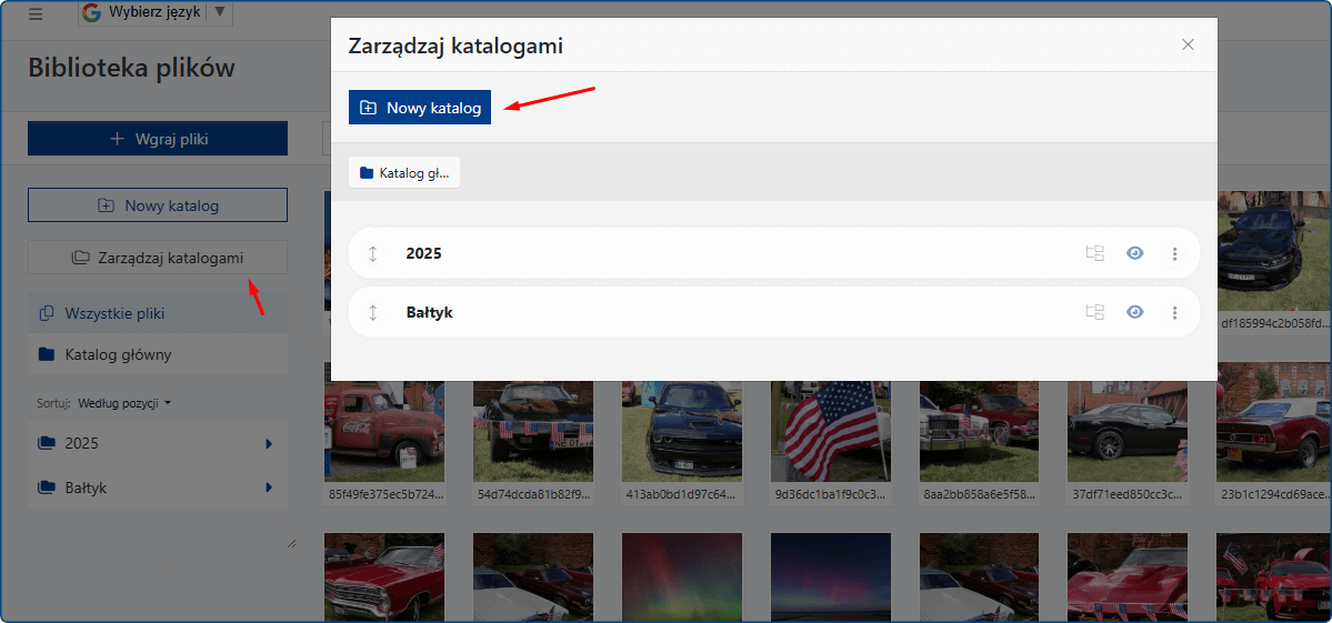Kliknięcie w przycisk Zarządzaj katalogami otwiera okno pop up umożliwiające: