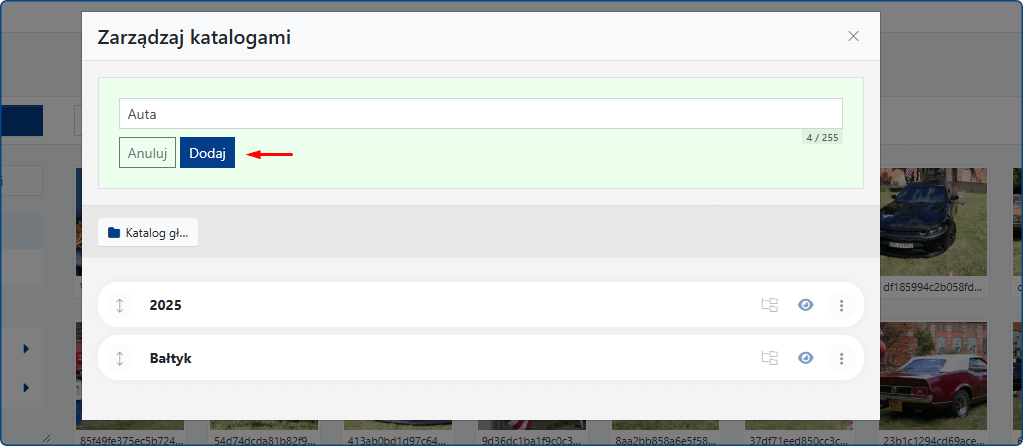 Wpisujemy nazwę katalogu i zapisujemy zmiany klikając w niebieski przycisk Dodaj. Nowy katalog pojawi się w dolnej części listy katalogów.
