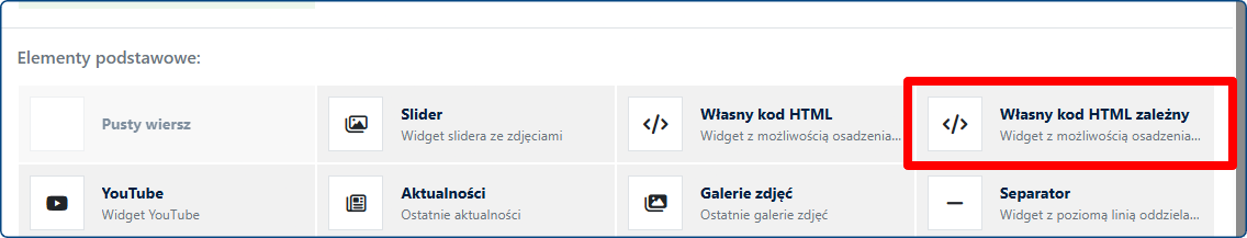Po przejściu do modułu Wizualizacja strony, przechodzimy do edycji wybranego szablonu. Następnie, po wybraniu opcji + Dodaj element wyświetlimy okno pop up z pulą dostępnych widgetów. Nowy widget znajduje się w prawym górnym rogu okna pop up.
