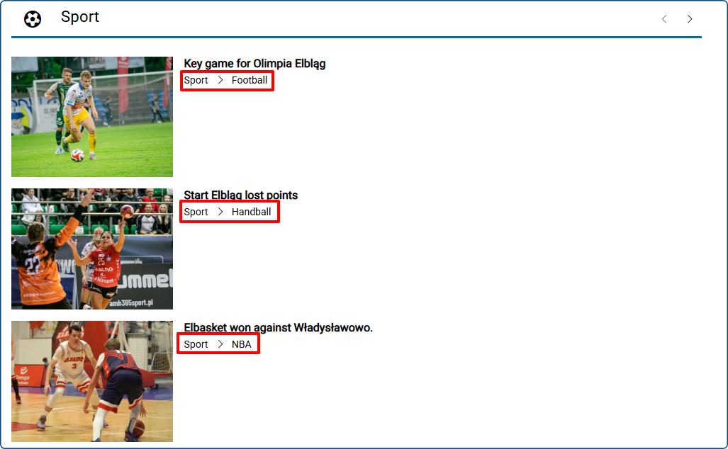 This setting applies to second- and third-level categories. If an article belongs to the category “Sport > Volleyball”, we can choose whether we want to show only the final category, or also its parent category.