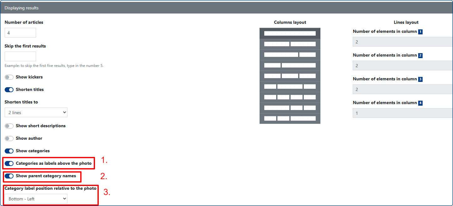 In the [Displaying results] section, there is the familiar “Show categories” toggle. When enabled, several options now appear, allowing you to display it as a label above the photo, and customize it: